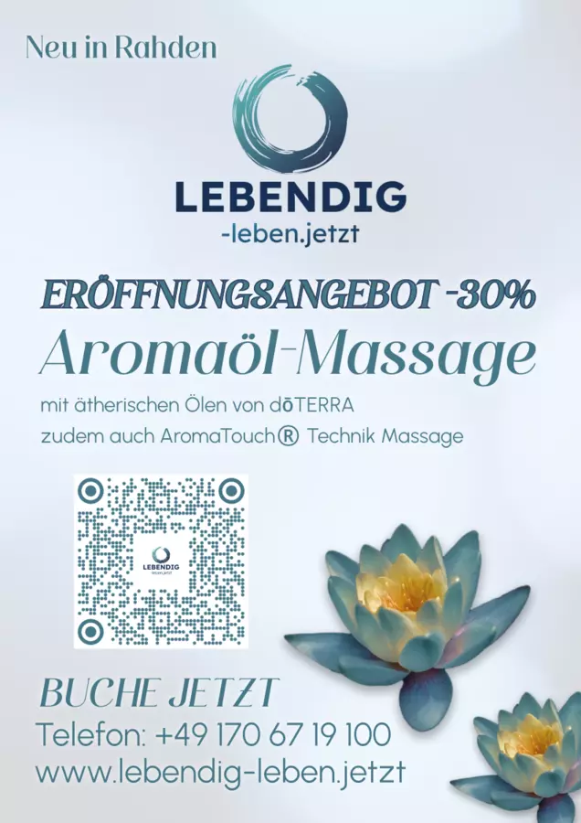 LEBENDIG leben und das jetzt! Ein Raum für echte Begegnung und spürbare Entspannung. Ich biete Aromaölmassage, Reiki-Energiearbeit, Achtsamkeits- und Breathwork-Sessions an, als ganzheitliche Auszeiten, die Nervensystem und Geist beruhigen, Verspannungen lösen und neue Klarheit schenken. Individuell abgestimmte Anwendungen, ruhige Atmosphäre – auf Wunsch auch mobil. Ideal zum Entschleunigen, Auftanken und Neu-Ausrichten. Termine einfach online buchen; Gutscheine erhältlich. Für Privatpersonen, Paare und alle, die Balance, Präsenz und Wohlbefinden stärken möchten.