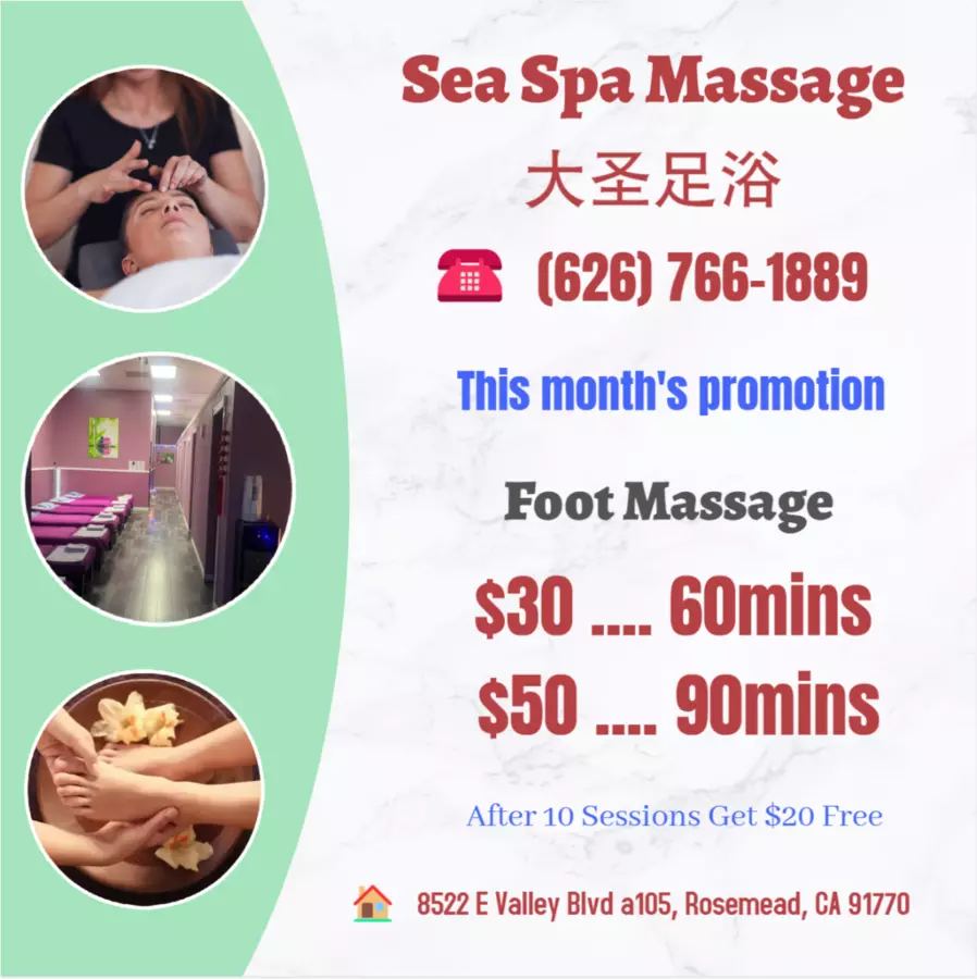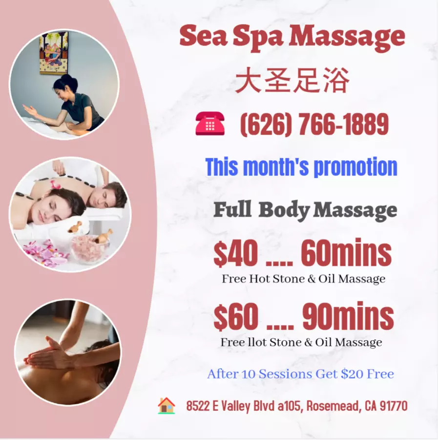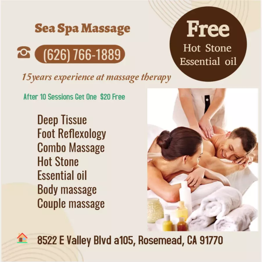 Sea Spa, located in Rosemead, CA, invites you to indulge in a rejuvenating escape at our tranquil Asian Massage Spa. Offering an array of massage services including full body massages and couples massages, Sea Spa is your go-to destination for relaxation and wellness in Rosemead. Experience the healing benefits of our expertly crafted treatments designed to melt away stress and soothe your mind and body. Whether you're searching for a massage near you or specifically seeking an Asian massage in the area, Sea Spa promises a blissful experience tailored to your needs.